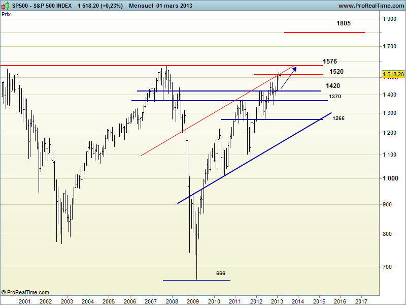 L’indice phare américain clôture une fois encore sur ce niveau, en hausse de 0,23 % à 1518 points, soit pour préparer une sortie vers les records à 1576, soit pour en rester là, et peut-être refluer face à un climat européen bien difficile. Pour sa part, le Dow Jones revient à 75 points de son record historique en clôture, sur un gain de 0,25 % à 14.090, et le Nasdaq progresse de 0,30 % à 3170, avec le soutien de la politique monétaire accommodante de la Fed.