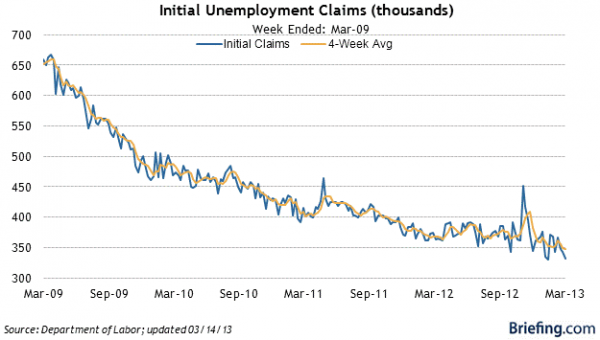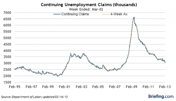 Aujourd’hui, ce sont les demandes hebdomadaires d’allocations au chômage au nombre de 332.000, et en deçà des 350.000 attendues qui étayent le scénario d’une économie beaucoup plus robuste que prévue au premier trimestre. C’est le chiffre le plus bas non retraité d’ajustements statistiques depuis janvier 2008, et il faut souligner qu’il s’accompagne de 3,09 million de demandes continues d’allocations, là où le marché en attendait 3,1 million, au plus bas depuis 5 ans. Certains diront que c’est le résultats d’un renoncement à rechercher du travail. Il n’empêche les courbes sont là :